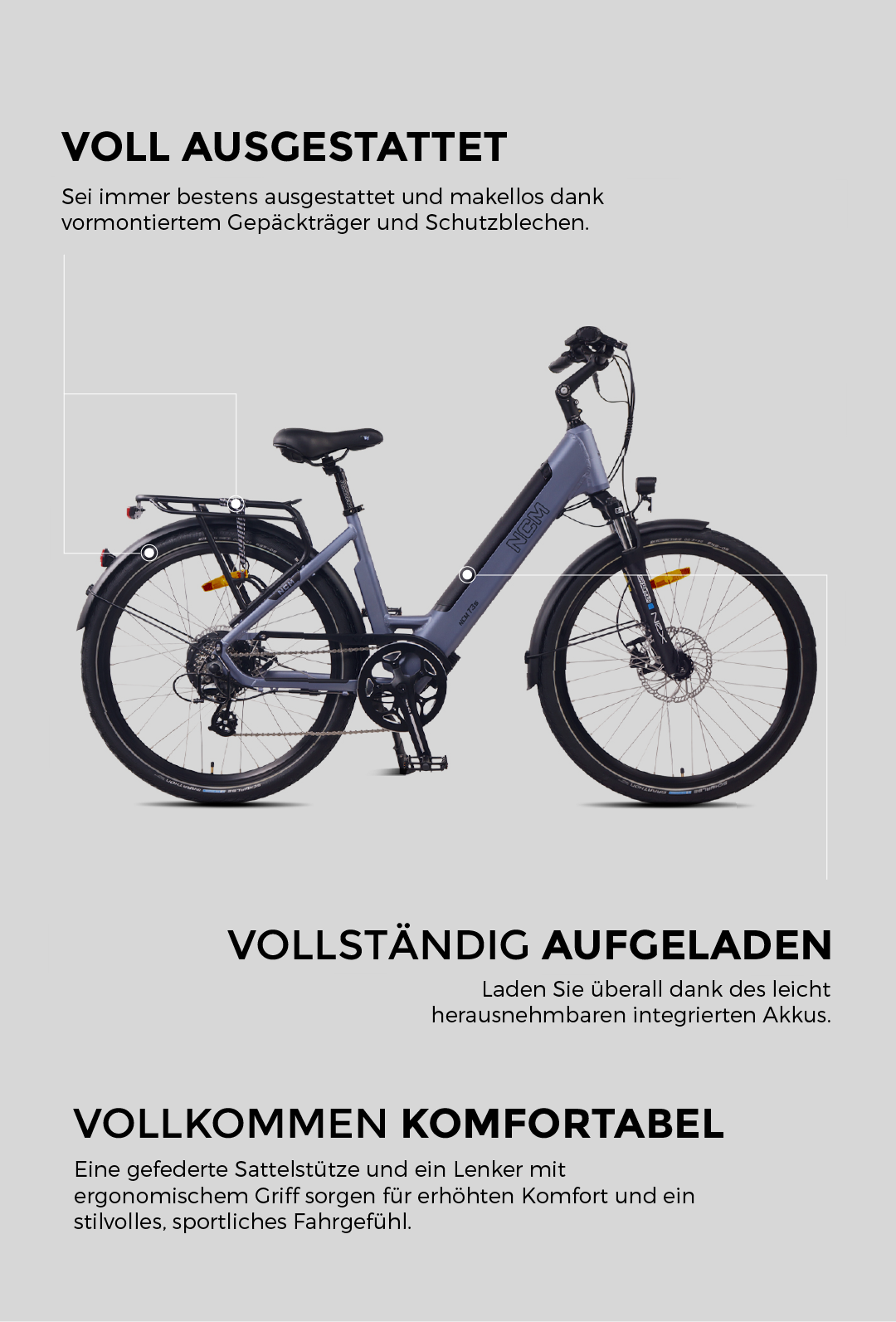 Das T3s ist ergonomisch gestaltet und individuell einstellbar, so dass du die perfekte Passform für dich findest. Ein verstellbarer Sitz und Lenker für eine bequeme aufrechte Sitzposition. Ein Gelsattel von Selle Royal, der das Gewicht gleichmäßig verteilt, den Rücken entlastet und dadurch mehr Komfort bietet
